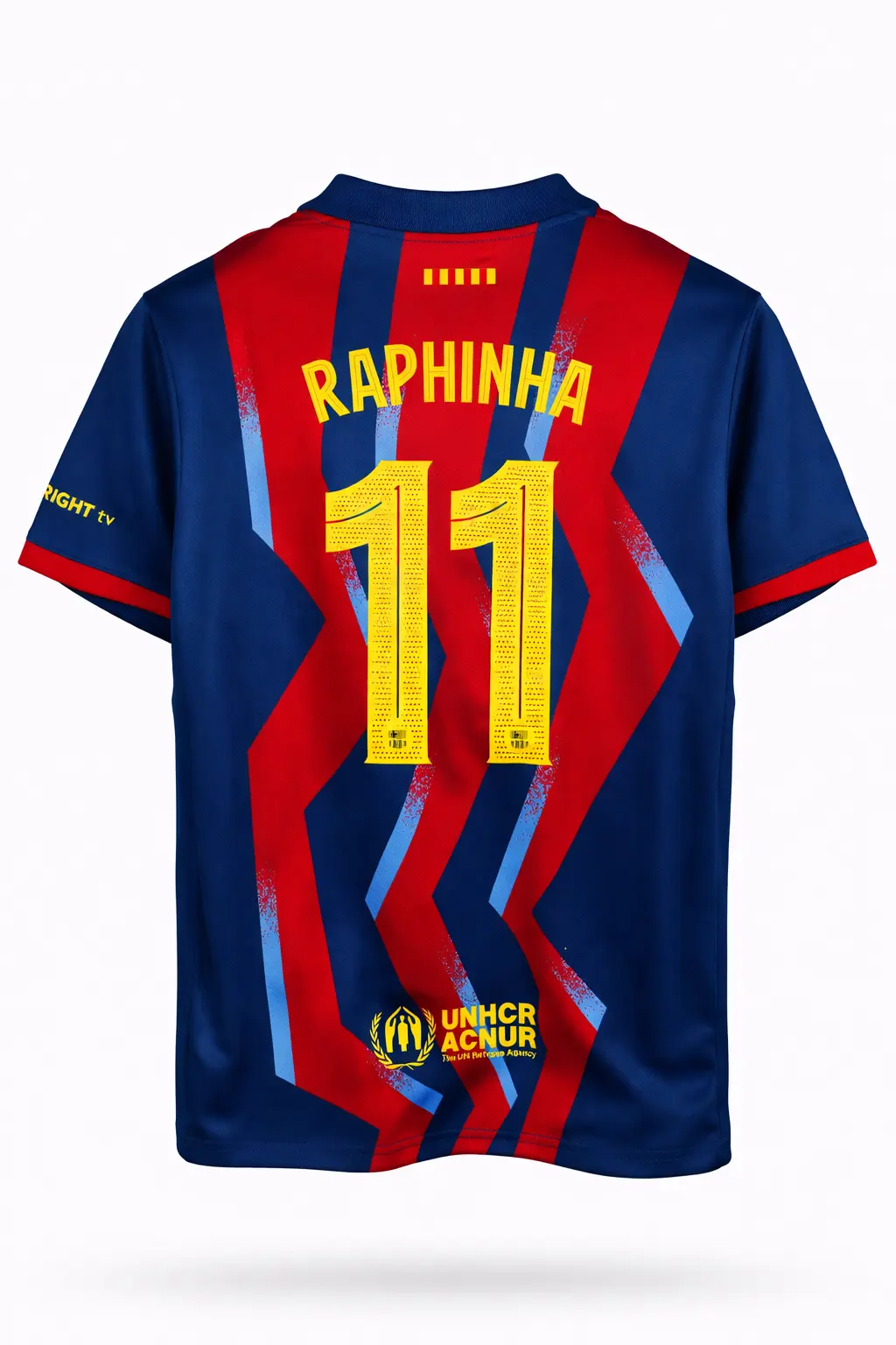 Форма футбольная детская клуба Барселона, домашний комплект "Эль Классико" нового сезона 2025/2026, с фамилией игрока Рафинья под номером 11.