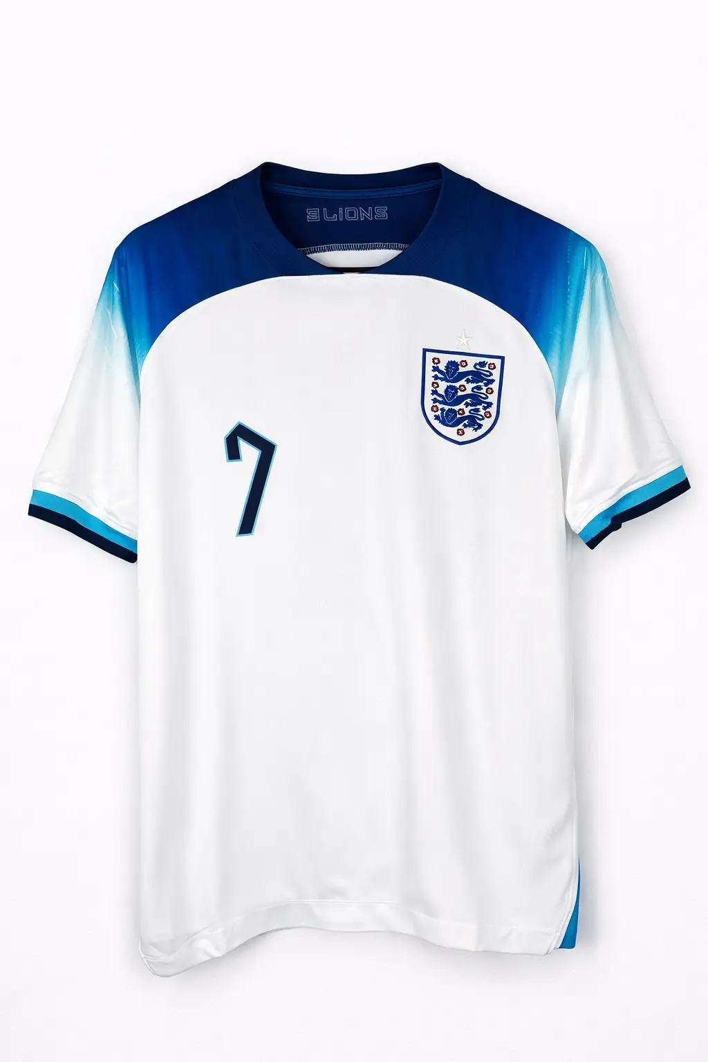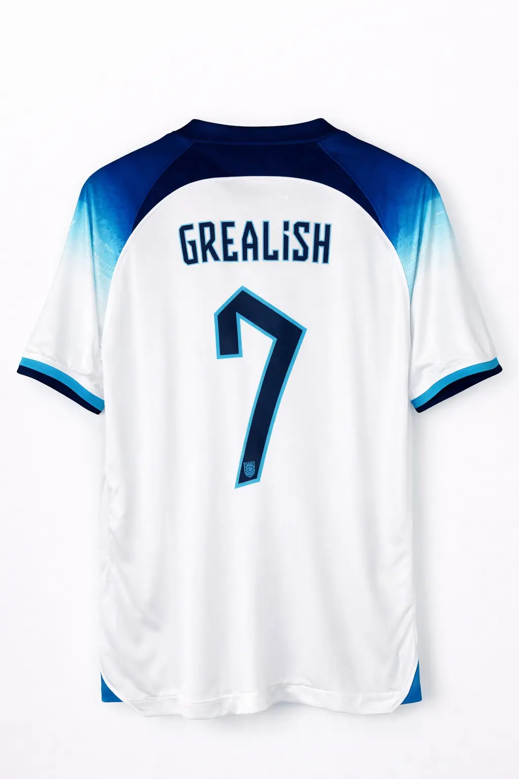 Футболка футбольная сборной Англии с фамилией игрока Джека Грилиша под номером 7, домашний комплект 2022/2023 годов.