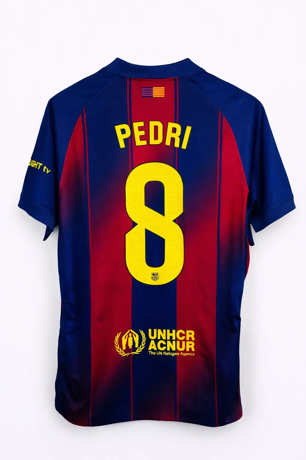 Футболка футбольная клуба Барселона с фамилией игрока Педри под номером 8, домашний комплект сезона 2025/2026.