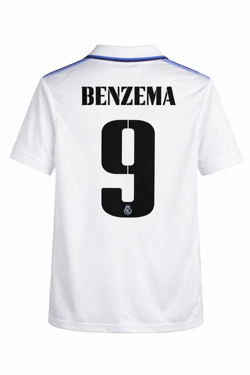 Футболка футбольная клуба Реал Мадрид с фамилией игрока Бензема под номером 9, домашний комплект сезона 2022/2023.
