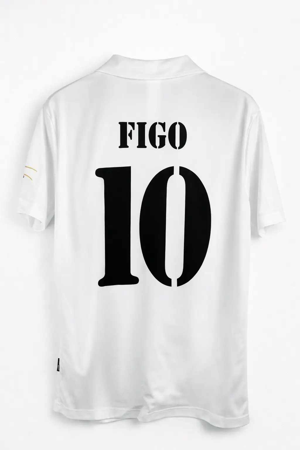Футбольная футболка клуба Реал Мадрид с фамилией игрока Луиша Фигу под номером 10, домашний комплект сезона 2002/2003.