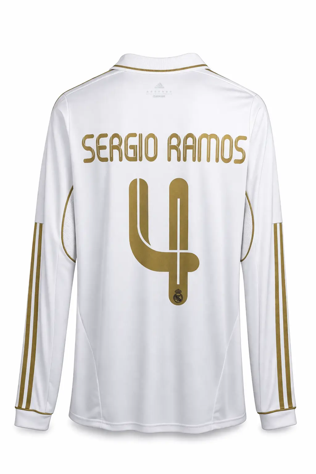 Футболка футбольная клуба Реал Мадрид с фамилией игрока Серхио Рамоса под номером 4, домашний комплект сезона 2011/2012.