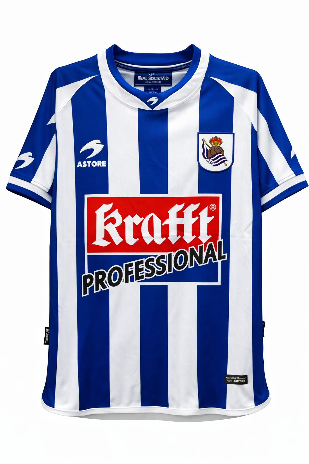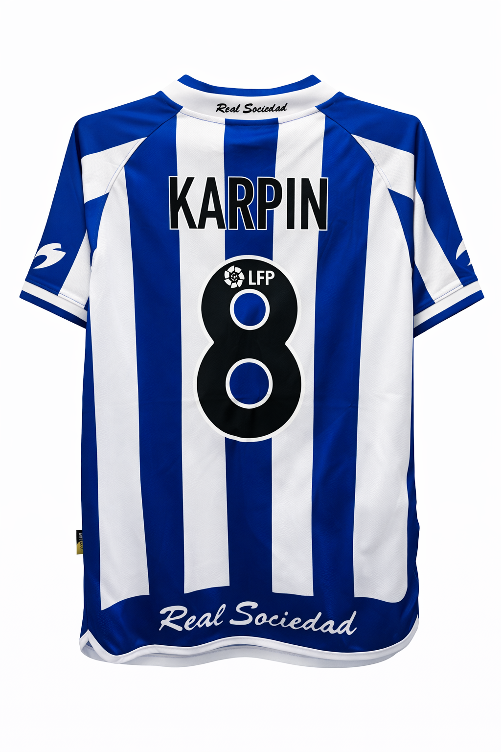 Футболка футбольная клуба Реал Сосьедад с фамилией игрока Карпин под номером 8, домашний комплект сезонов 2000/2001 и 2002/2003.