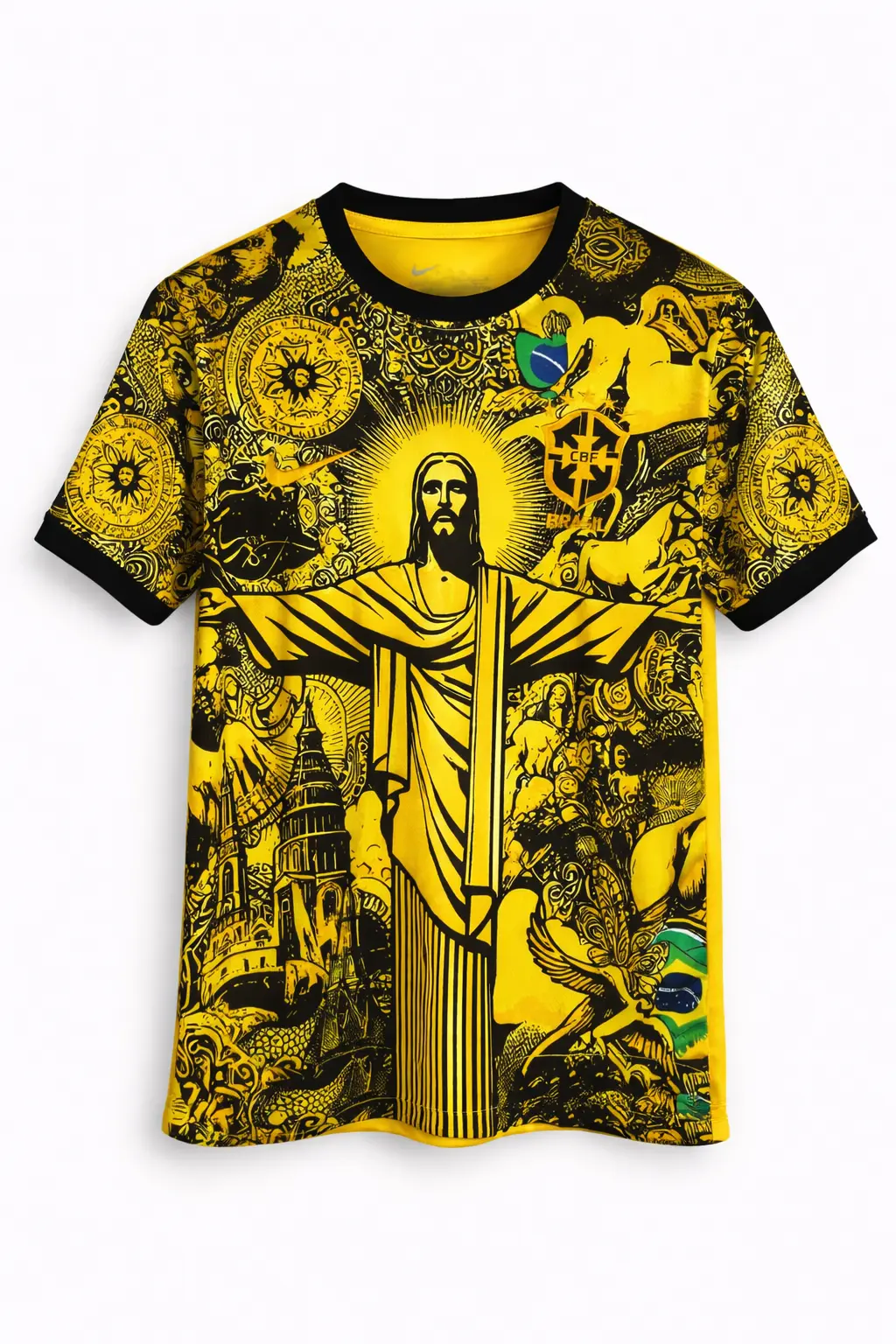 Уникальный принт с центральной фигурой статуи Христа-Искупителя в Рио-де-Жанейро на фоне желто-черных графических элементов в бразильском стиле.