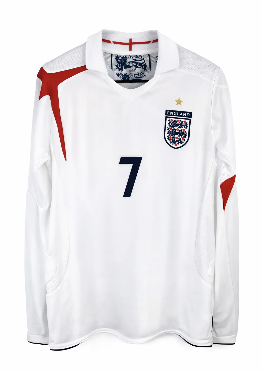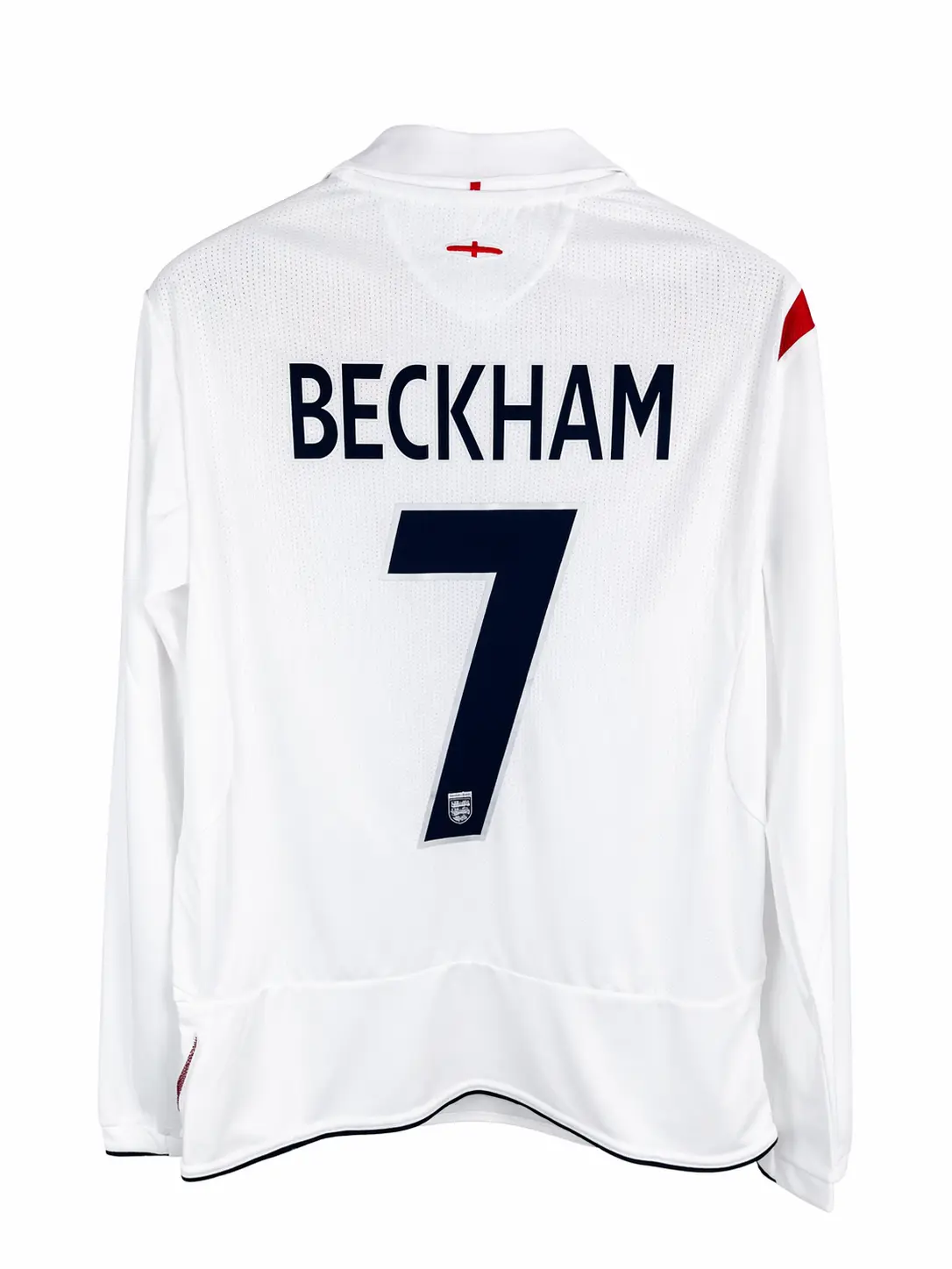 Футболка футбольная сборной Англии с фамилией игрока Дэвида Бекхэма под номером 7, домашний комплект 2005, 2006 и 2007 годов.